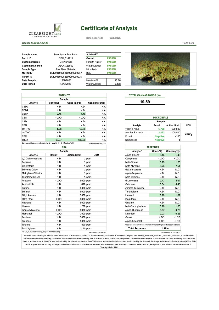 THC 19.15% Cannabinoids 19.59% Terpenes 1.98%